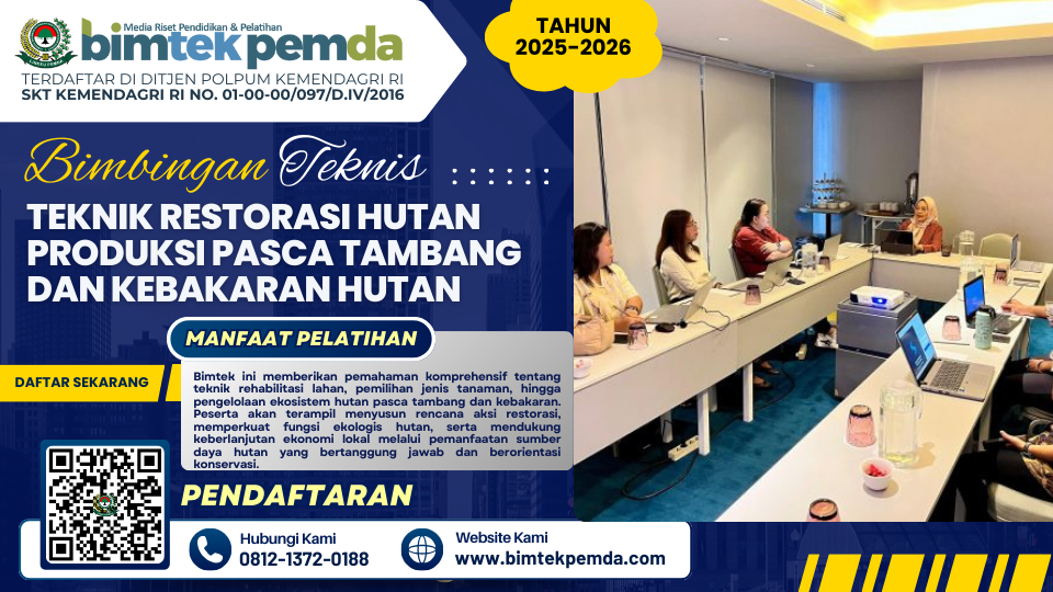 Bimtek ini menjadi langkah strategis untuk meningkatkan kapasitas dan kompetensi pengelolaan hutan produksi pasca kerusakan. Sehubungan dengan itu kami dari Pusat Diklat dan Bimtek Pemerintahan Lembaga Informasi Keuangan Pembangunan Daerah (BIMTEK PEMDA) selaku penyelenggara kegiatan serta dukungan narasumber yang berkompeten dibidangnya, Mengundang Bapak/Ibu untuk mengikuti kegiatan “Bimtek Teknik Restorasi Hutan Produksi Pasca Tambang dan Kebakaran Hutan” yang akan dilaksanakan.