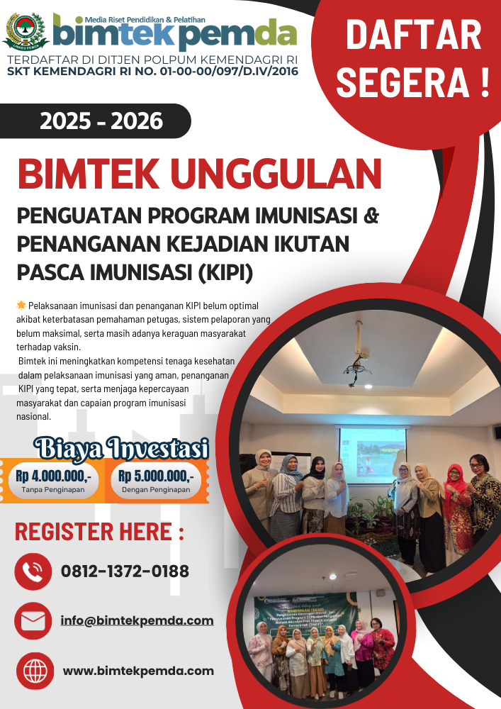 Bimtek Unggulan Penguatan Program Imunisasi & Penanganan KIPI hadir sebagai solusi strategis untuk menjawab berbagai tantangan tersebut. Kegiatan bimbingan teknis ini dirancang untuk meningkatkan kapasitas aparatur kesehatan, pengelola program imunisasi, serta tenaga pelaksana layanan kesehatan agar mampu menjalankan program imunisasi secara aman, efektif, dan berkelanjutan sesuai kebijakan nasional dan standar teknis terbaru.