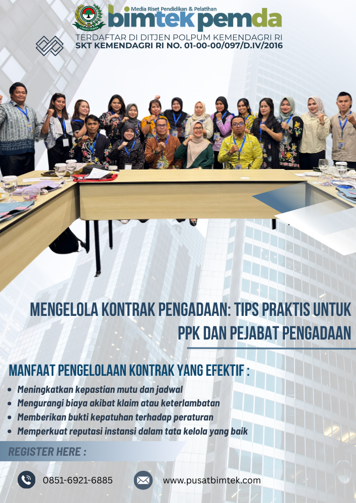 Tingkatkan kapasitas tim Anda dengan praktik manajemen kontrak yang terstruktur. Pastikan setiap tahapan pengadaan berjalan sesuai peraturan dan menghasilkan nilai manfaat optimal bagi masyarakat.