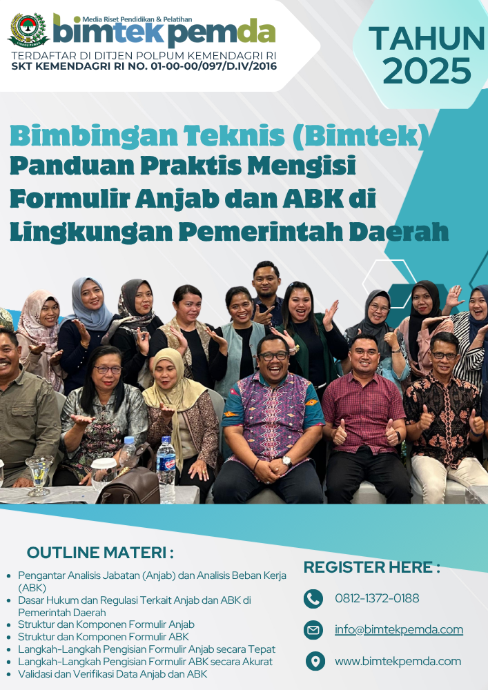 Penguasaan teknik pengisian formulir Anjab dan ABK biasanya diperoleh melalui Bimtek Penyusunan dan Perhitungan Anjab ABK: Mewujudkan Efisiensi dan Kinerja Optimal Aparatur Sipil Negara, yang membekali peserta dengan kemampuan teknis dan praktik langsung dalam menyusun dokumen analisis jabatan serta beban kerja.