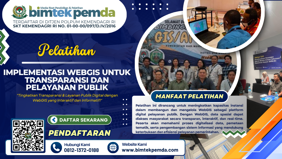 Pelatihan ini merupakan bagian dari komitmen pemerintah dalam mewujudkan tata kelola yang terbuka, partisipatif, dan digital. Dengan kemampuan teknis dalam membangun dan mengembangkan WebGIS, instansi pemerintah dapat menyajikan data spasial secara transparan dan mempercepat pelayanan publik yang berbasis wilayah. Sehubungan dengan itu kami dari Pusat Diklat dan Bimtek Pemerintahan Lembaga Informasi Keuangan Pembangunan Daerah (BIMTEK PEMDA) selaku penyelenggara kegiatan serta dukungan  narasumber yang berkompeten dibidangnya, Mengundang Bapak/Ibu untuk mengikuti kegiatan PELATIHAN IMPLEMENTASI WEBGIS UNTUK TRANSPARANSI DAN PELAYANAN PUBLIK yang akan dilaksanakan.