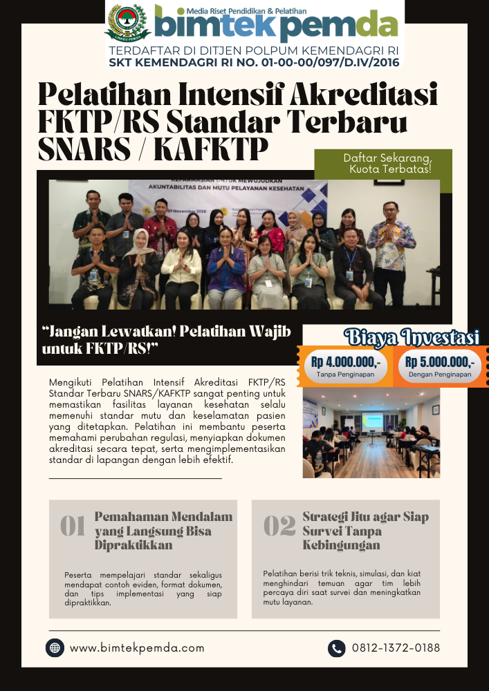 Pelatihan Intensif Akreditasi FKTP/RS standar terbaru SNARS dan KAFKTP untuk meningkatkan mutu layanan, keselamatan pasien, dan kesiapan akreditasi fasilitas kesehatan.