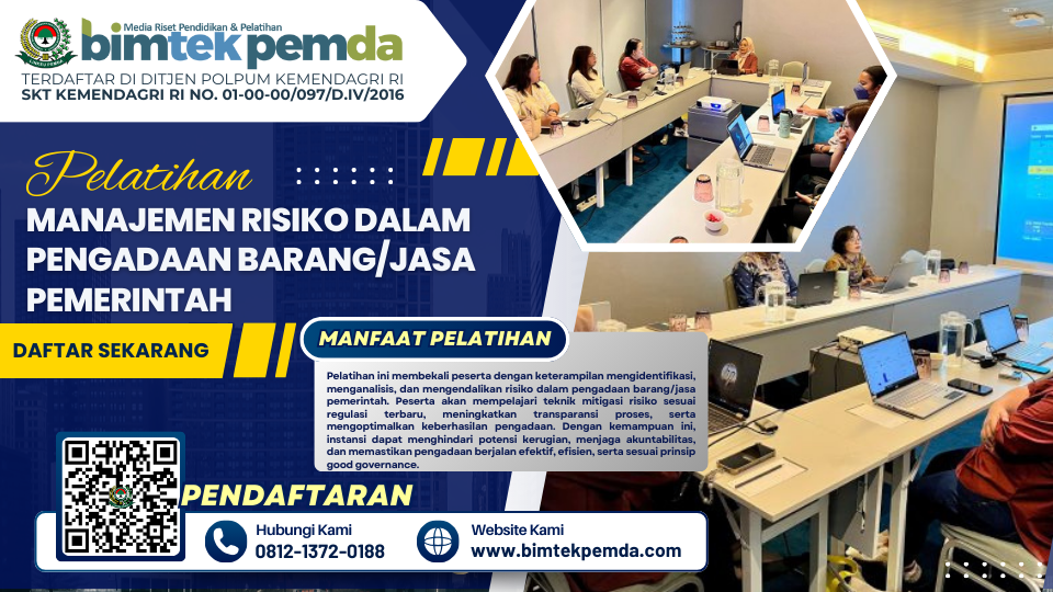 Dengan penerapan manajemen risiko yang tepat, instansi dapat mengantisipasi permasalahan sejak dini, mengoptimalkan proses pengadaan, dan mewujudkan pengelolaan anggaran yang efektif, efisien, serta akuntabel. Sehubungan dengan itu kami dari Pusat Diklat dan Bimtek Pemerintahan Lembaga Informasi Keuangan Pembangunan Daerah (BIMTEK PEMDA) selaku penyelenggara kegiatan serta dukungan narasumber yang berkompeten dibidangnya, Mengundang Bapak/Ibu untuk mengikuti kegiatan yang akan dilaksanakan.