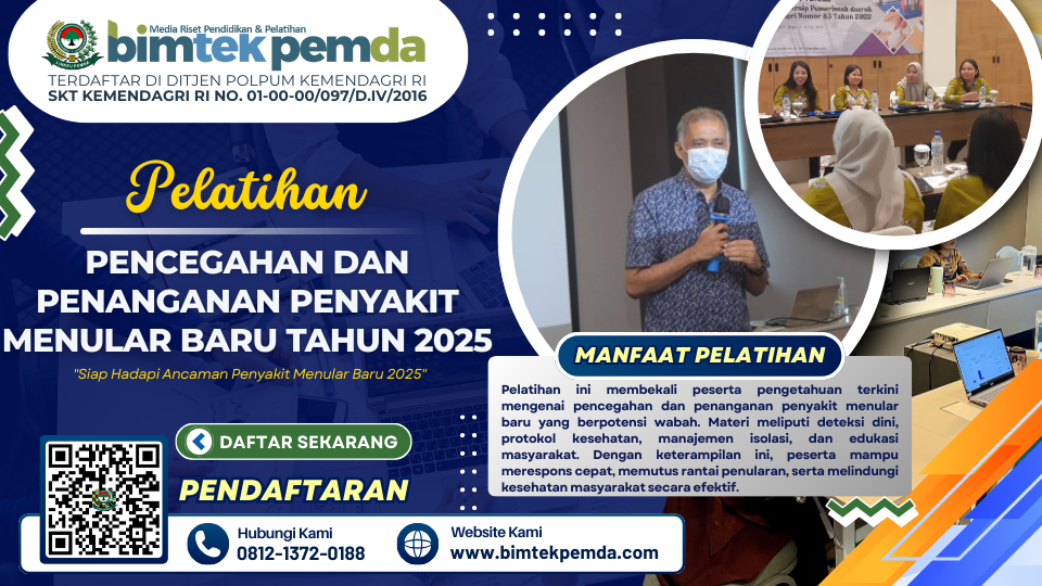 Pelatihan ini diharapkan meningkatkan kapasitas peserta dalam menghadapi ancaman penyakit menular baru, sehingga mampu mencegah penyebaran dan melindungi kesehatan masyarakat secara efektif. Sehubungan dengan itu kami dari Pusat Diklat dan Bimtek Pemerintahan Lembaga Informasi Keuangan Pembangunan Daerah (BIMTEK PEMDA) selaku penyelenggara kegiatan serta dukungan narasumber yang berkompeten dibidangnya, Mengundang Bapak/Ibu untuk mengikuti kegiatan yang akan dilaksanakan.