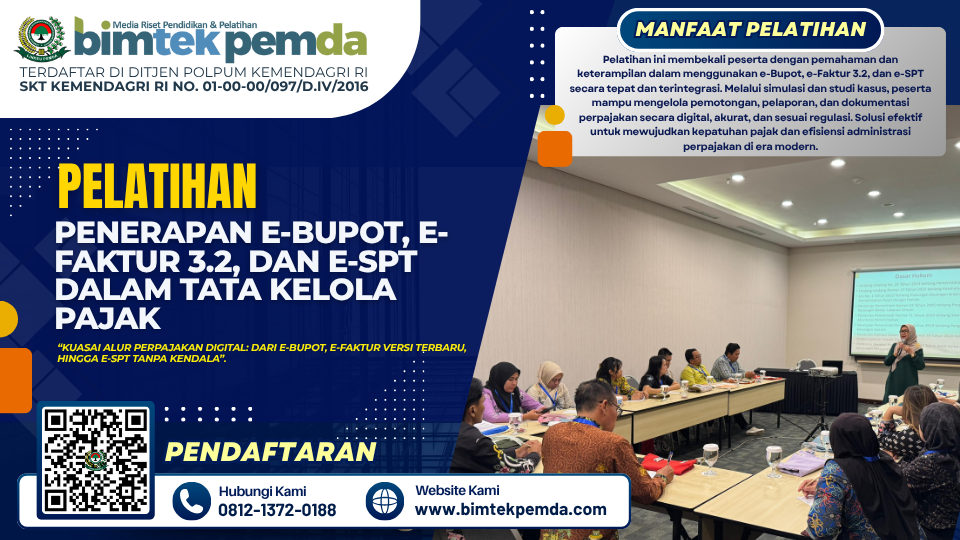 Dengan adanya pelatihan ini, diharapkan peserta mampu menerapkan sistem pelaporan pajak elektronik secara efektif dan efisien. Hal ini akan mendukung pencapaian tata kelola perpajakan yang lebih baik serta meningkatkan kepatuhan dan transparansi dalam pengelolaan pajak. Sehubungan dengan itu kami dari Pusat Diklat dan Bimtek Pemerintahan Lembaga Informasi Keuangan Pembangunan Daerah (BIMTEK PEMDA) selaku penyelenggara kegiatan serta dukungan narasumber yang berkompeten dibidangnya, Mengundang Bapak/Ibu untuk mengikuti kegiatan ”PELATIHAN PENERAPAN E-BUPOT, E-FAKTUR 3.2, DAN E-SPT DALAM TATA KELOLA PAJAK“ yang akan dilaksanakan.