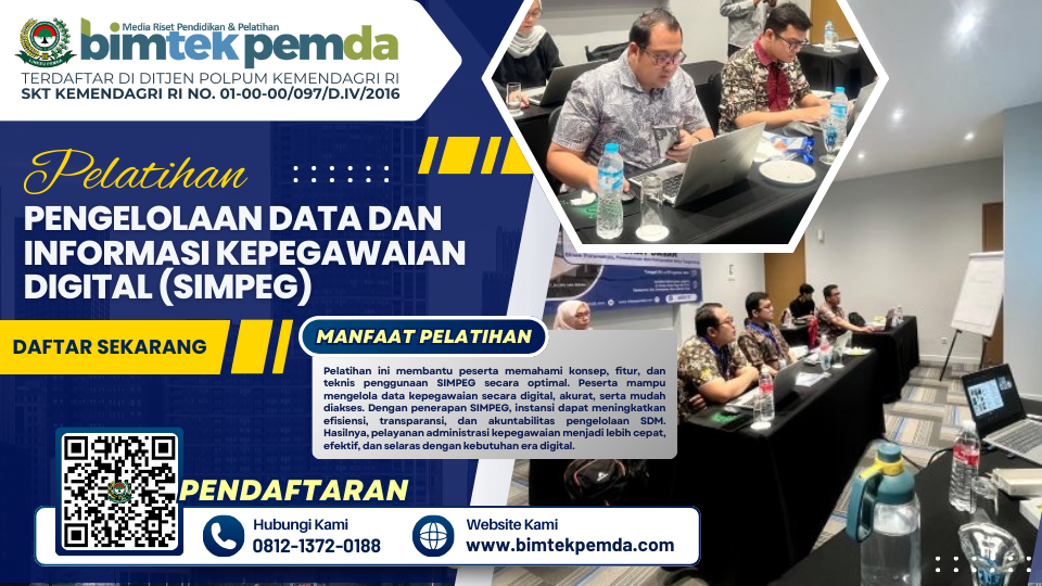 Pelatihan Pengelolaan Data & Informasi Kepegawaian Digital (SIMPEG) menjadi langkah penting dalam membangun birokrasi modern yang berbasis data dan teknologi. Sehubungan dengan itu kami dari Pusat Diklat dan Bimtek Pemerintahan Lembaga Informasi Keuangan Pembangunan Daerah (BIMTEK PEMDA) selaku penyelenggara kegiatan serta dukungan narasumber yang berkompeten dibidangnya, Mengundang Bapak/Ibu untuk mengikuti kegiatan yang akan dilaksanakan.