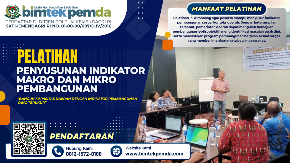 Pelatihan Penyusunan Indikator Makro dan Mikro Pembangunan diharapkan dapat meningkatkan pemahaman dan keterampilan aparatur dalam merumuskan indikator pembangunan yang akurat, relevan, dan selaras dengan dokumen perencanaan. Sehubungan dengan itu kami dari Pusat Diklat dan Bimtek Pemerintahan Lembaga Informasi Keuangan Pembangunan Daerah (BIMTEK PEMDA) selaku penyelenggara kegiatan serta dukungan narasumber yang berkompeten dibidangnya, Mengundang Bapak/Ibu untuk mengikuti kegiatan yang akan dilaksanakan.