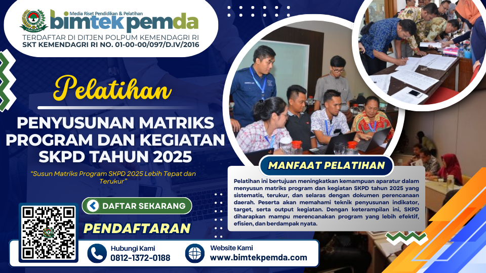 Pelatihan Penyusunan Matriks Program & Kegiatan SKPD ini diharapkan mampu meningkatkan kompetensi aparatur dalam merumuskan program yang terukur, sistematis, dan terintegrasi. Sehubungan dengan itu kami dari Pusat Diklat dan Bimtek Pemerintahan Lembaga Informasi Keuangan Pembangunan Daerah (BIMTEK PEMDA) selaku penyelenggara kegiatan serta dukungan  narasumber yang berkompeten dibidangnya, Mengundang Bapak/Ibu untuk mengikuti kegiatan yang akan dilaksanakan.