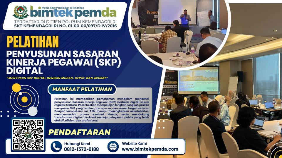 Pelatihan Penyusunan SKP Digital ini merupakan upaya strategis untuk meningkatkan profesionalisme ASN sekaligus mendorong efektivitas birokrasi modern. Sehubungan dengan itu kami dari Pusat Diklat dan Bimtek Pemerintahan Lembaga Informasi Keuangan Pembangunan Daerah (BIMTEK PEMDA) selaku penyelenggara kegiatan serta dukungan narasumber yang berkompeten dibidangnya, Mengundang Bapak/Ibu untuk mengikuti kegiatan “Pelatihan Penyusunan Sasaran Kinerja Pegawai (SKP) Digital” yang akan dilaksanakan.