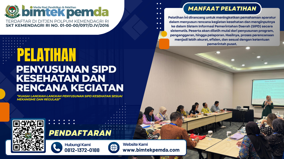 Pelatihan Penyusunan SIPD Kesehatan dan Rencana Kegiatan bertujuan meningkatkan kemampuan teknis perencana dalam menginput program dan kegiatan sektor kesehatan ke dalam Sistem Informasi Pemerintahan Daerah (SIPD). Materi mencakup kebijakan perencanaan, tahapan input SIPD, penyusunan indikator, dan sinkronisasi dengan dokumen perencanaan daerah seperti Renja dan RKPD. Dengan pelatihan ini, peserta dapat menyusun rencana kegiatan yang efisien, tepat sasaran, dan sesuai regulasi. Sangat penting bagi Dinas Kesehatan, Puskesmas, dan tim perencana untuk mendukung tata kelola perencanaan pembangunan kesehatan yang lebih transparan dan berbasis data.