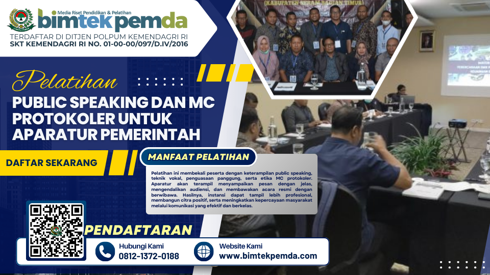 Melalui Pelatihan Public Speaking dan MC Protokoler ini, diharapkan aparatur pemerintah memiliki kemampuan komunikasi yang lebih baik, percaya diri, dan profesional. Sehubungan dengan itu kami dari Pusat Diklat dan Bimtek Pemerintahan Lembaga Informasi Keuangan Pembangunan Daerah (BIMTEK PEMDA) selaku penyelenggara kegiatan serta dukungan  narasumber yang berkompeten dibidangnya, Mengundang Bapak/Ibu untuk mengikuti kegiatan Pelatihan Public Speaking dan MC Protokoler untuk Aparatur Pemerintah” yang akan dilaksanakan.