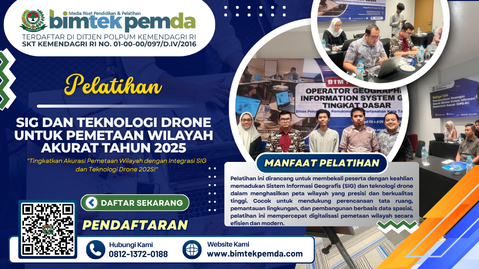 Pelatihan ini dirancang untuk memperkuat kapasitas teknis instansi pemerintah dan stakeholder lainnya dalam menghadirkan data spasial yang akurat, cepat, dan relevan melalui integrasi SIG dan drone. Sehubungan dengan itu kami dari Pusat Diklat dan Bimtek Pemerintahan Lembaga Informasi Keuangan Pembangunan Daerah (BIMTEK PEMDA) selaku penyelenggara kegiatan serta dukungan narasumber yang berkompeten dibidangnya, Mengundang Bapak/Ibu untuk mengikuti kegiatan ”Pelatihan SIG dan Teknologi Drone untuk Pemetaan Wilayah Akurat Tahun 2025“ yang akan dilaksanakan.