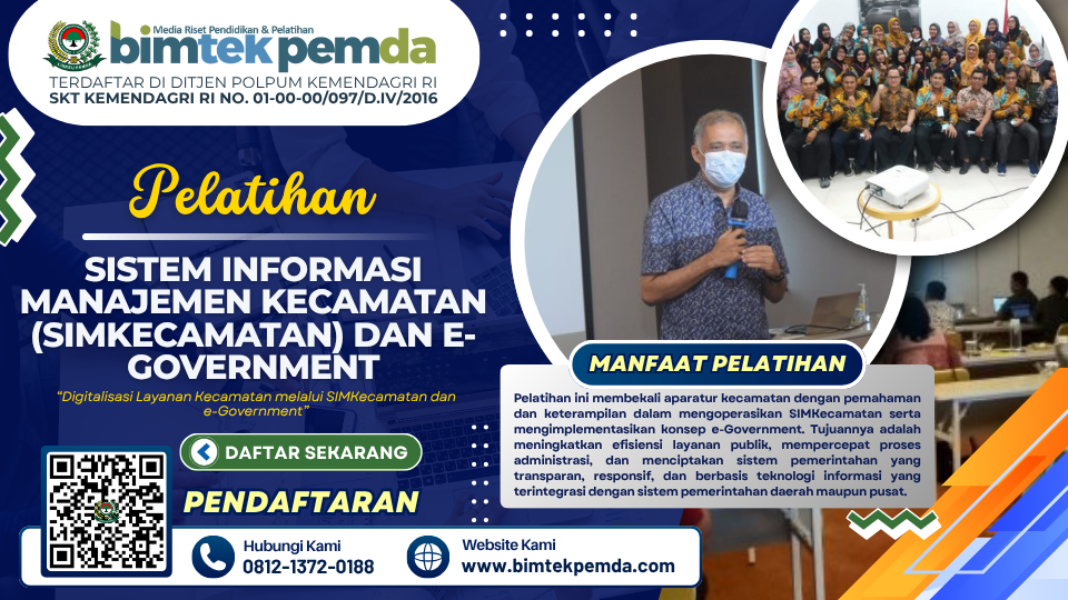 Pelatihan ini merupakan upaya nyata untuk meningkatkan kualitas tata kelola pemerintahan kecamatan melalui pemanfaatan sistem informasi dan teknologi digital. Sehubungan dengan itu kami dari Pusat Diklat dan Bimtek Pemerintahan Lembaga Informasi Keuangan Pembangunan Daerah (BIMTEK PEMDA) selaku penyelenggara kegiatan serta dukungan narasumber yang berkompeten dibidangnya, Mengundang Bapak/Ibu untuk mengikuti kegiatan ”Pelatihan Sistem Informasi Manajemen Kecamatan (SIMKecamatan) dan e-Government” yang akan dilaksanakan.