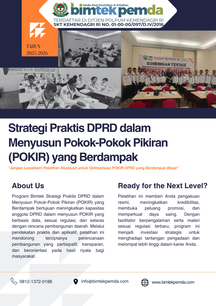 Tingkatkan kapasitas DPRD Anda dengan mengikuti pelatihan dan Bimtek penyusunan Pokok-Pokok Pikiran (POKIR) yang aplikatif dan berdampak nyata bagi masyarakat. Hubungi kami untuk informasi jadwal dan kerja sama pelatihan terbaru.