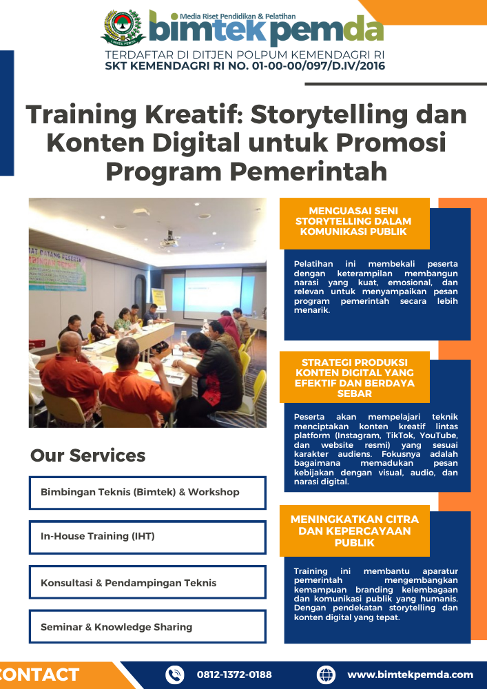 Training kreatif storytelling dan konten digital untuk promosi program pemerintah, meningkatkan citra publik, serta memperkuat komunikasi dan kepercayaan masyarakat.