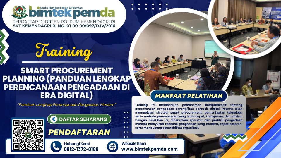 Training Smart Procurement Planning ini menjadi langkah nyata dalam mewujudkan tata kelola pengadaan yang lebih adaptif terhadap era digital. Sehubungan dengan itu kami dari Pusat Diklat dan Bimtek Pemerintahan Lembaga Informasi Keuangan Pembangunan Daerah (BIMTEK PEMDA) selaku penyelenggara kegiatan serta dukungan  narasumber yang berkompeten dibidangnya, Mengundang Bapak/Ibu untuk mengikuti kegiatan yang akan dilaksanakan.